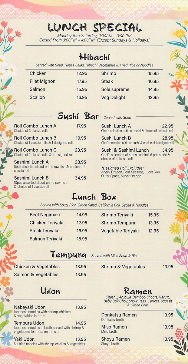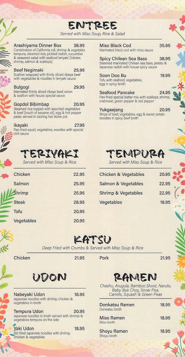 Welcome to Arashiyama Japanese Sushi & Steakhouse, where authentic Japanese cuisine meets exceptional hospitality. Located at 215 Washington Ave, Endicott, NY, this restaurant offers a diverse menu featuring mouth-watering teriyaki dishes, flavorful ramen, and delectable udon. The teriyaki options range from Tender Salmon ($25.95) to succulent Steak ($28.95), catering to both meat lovers and vegetarians with Tofu and Vegetable choices.